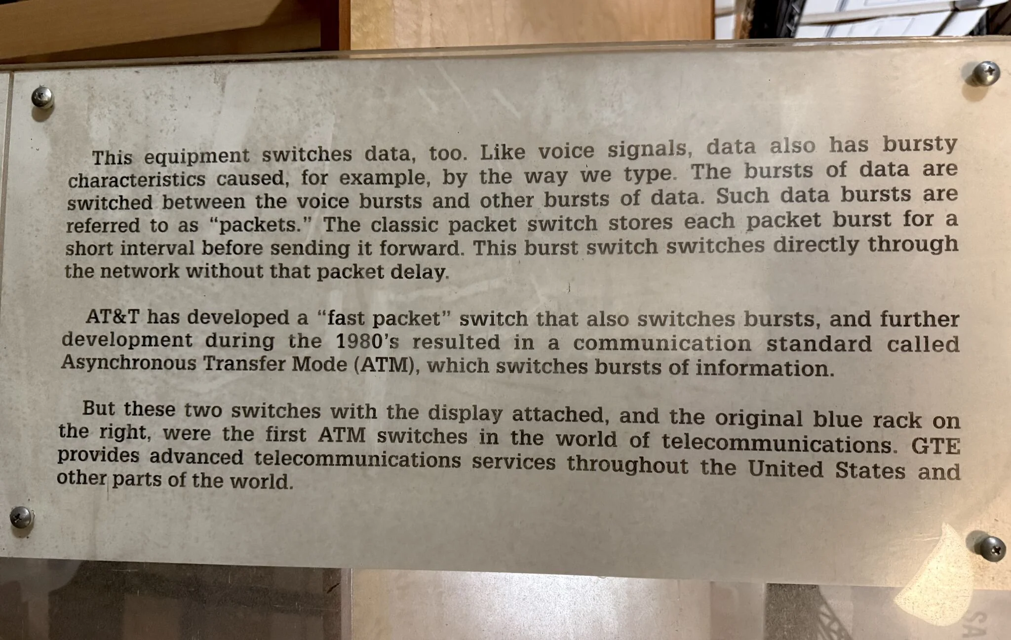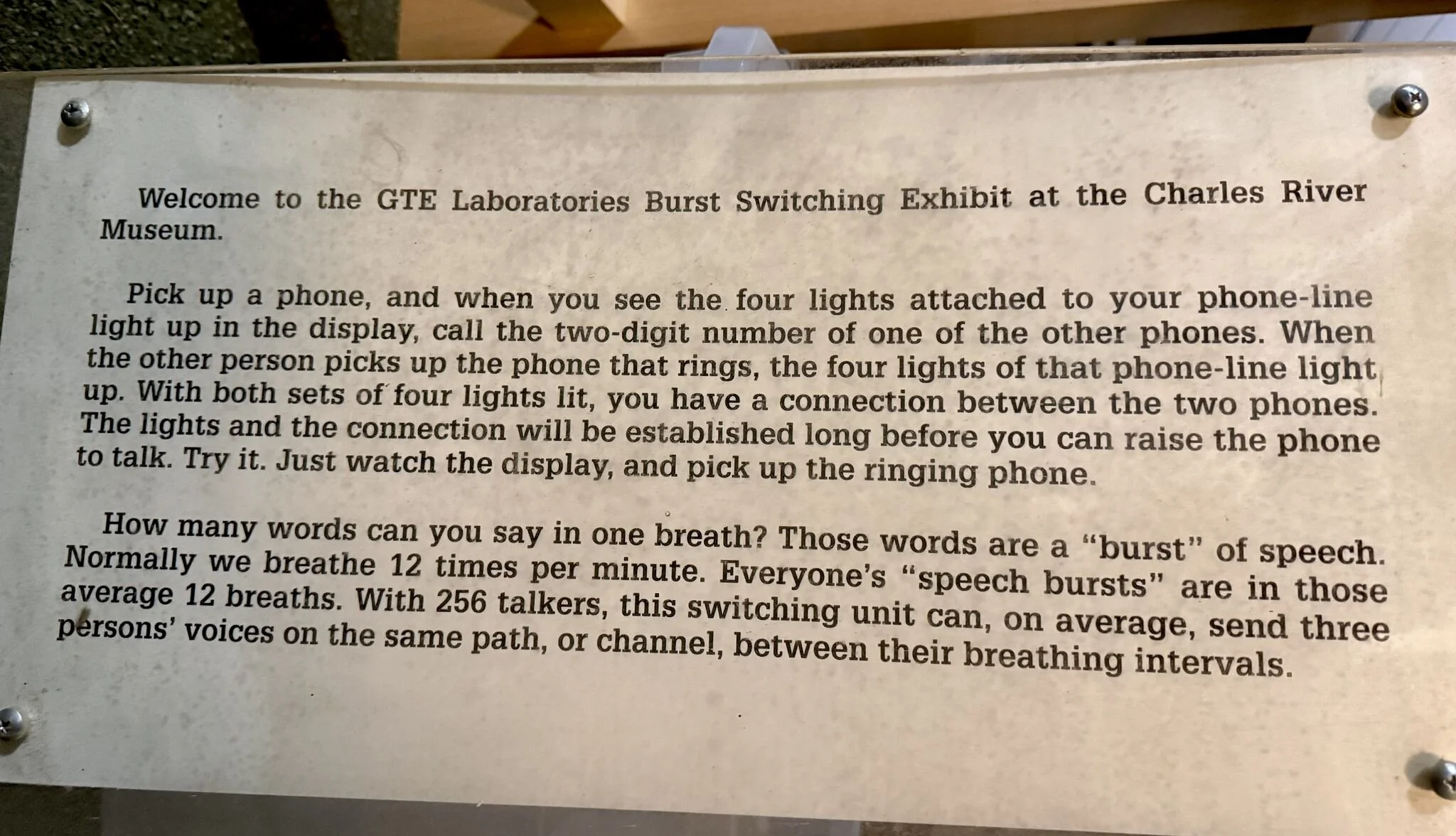 "Welcome to the GTE Laboratories Burst Switching Exhibit at the Charles River Museum.